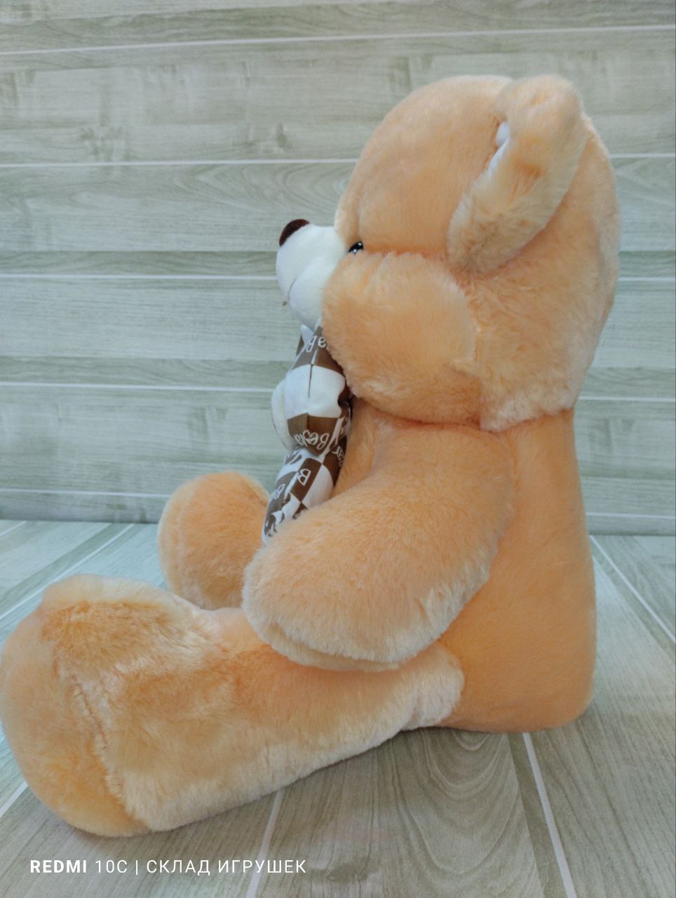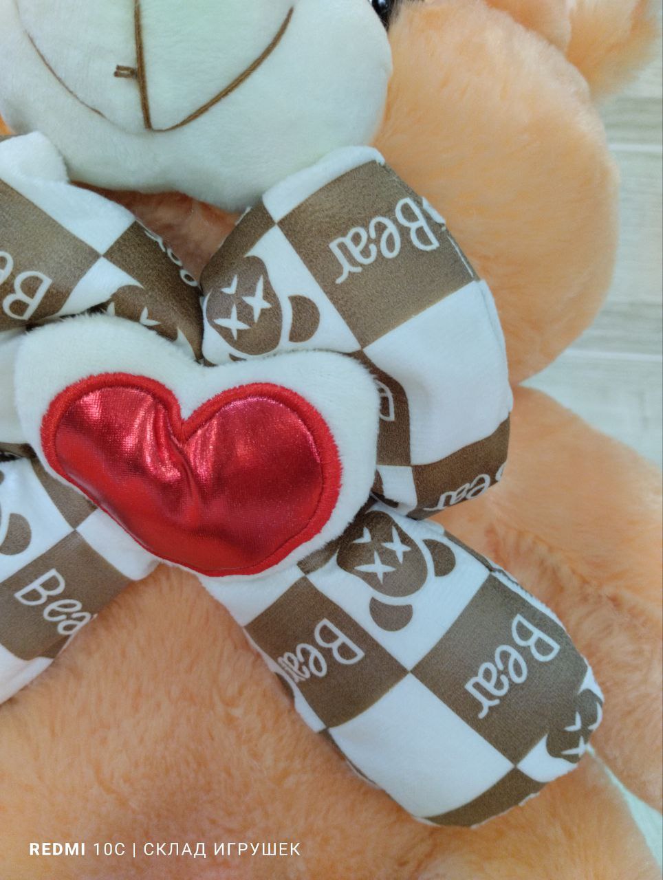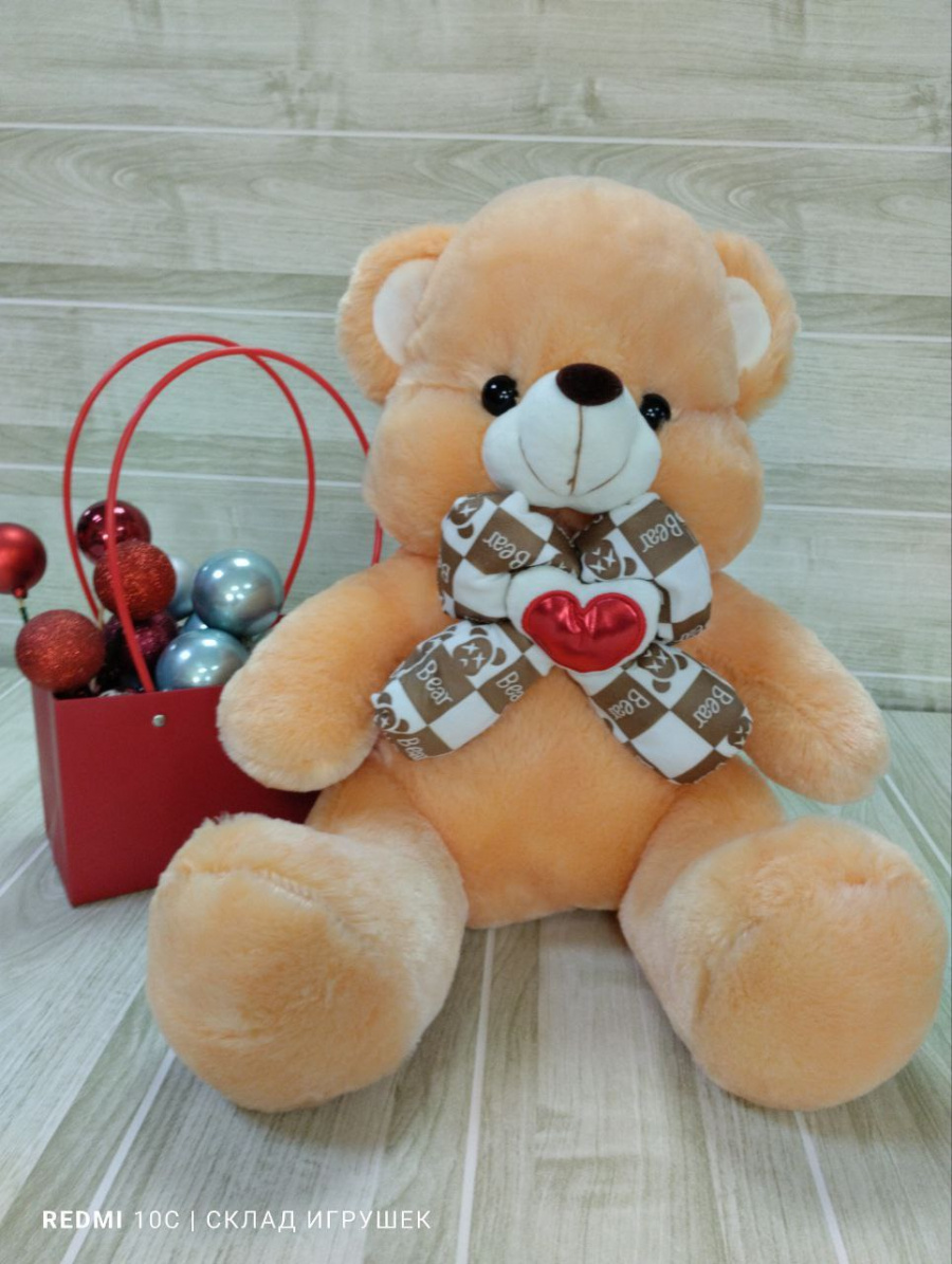 Мишка бежевый с бантом и сердечком 40 см.