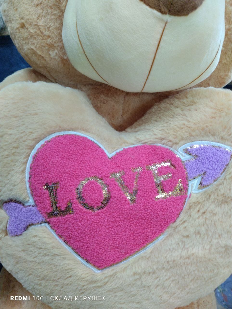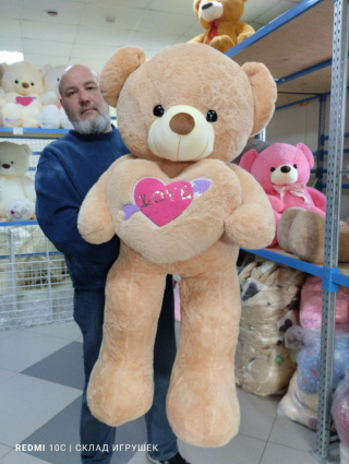 Мишка бежевый с бежевым сердцем и вышивкой на нем 130 см.