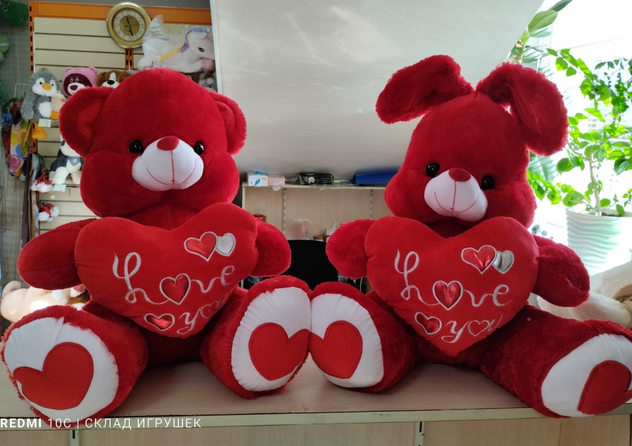 Мишка красный с красным сердцем и надписью 50 СМ (СПИНА)