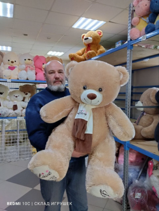 Мишка мохнатый с шарфом молочный (70 см.спина)