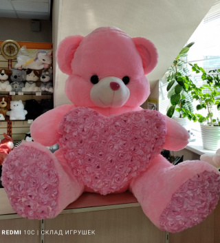 Мишка розовый с розовым сердцем в цветах 80 см.