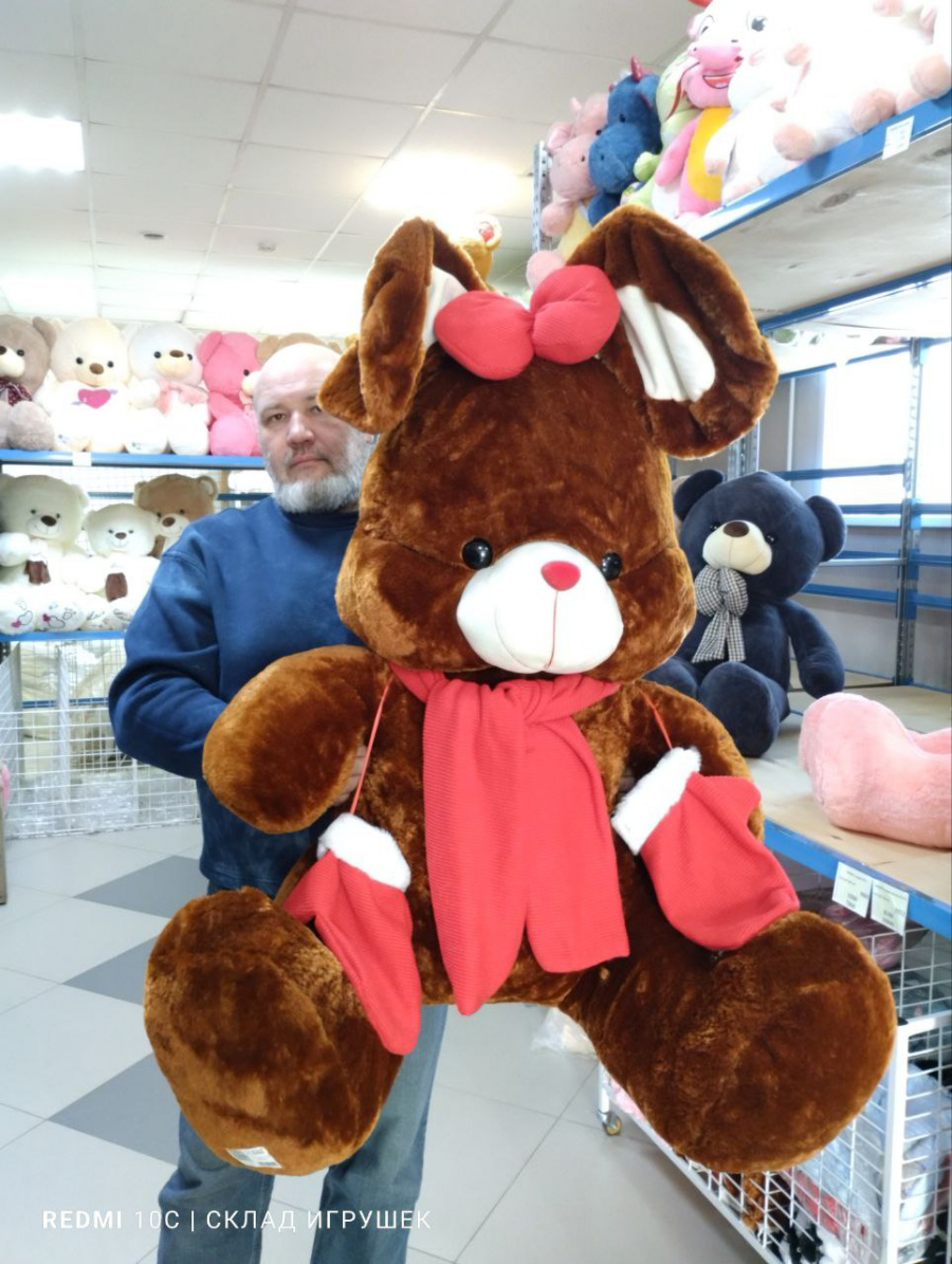 Заяц коричневый с варежками и шарфом 90см. спина